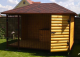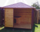 В комплекте с вольером идет будка наружные размеры: 1.15 м ширина, 85 см глубина, толщина стенок 35 мм, снаружи будка скрыта водоустойчивым лаком. И кладовая для хранения вещей, корма и других предметов. Размеры кладовой : ширина 1.10 м глубина 2.30 метра.